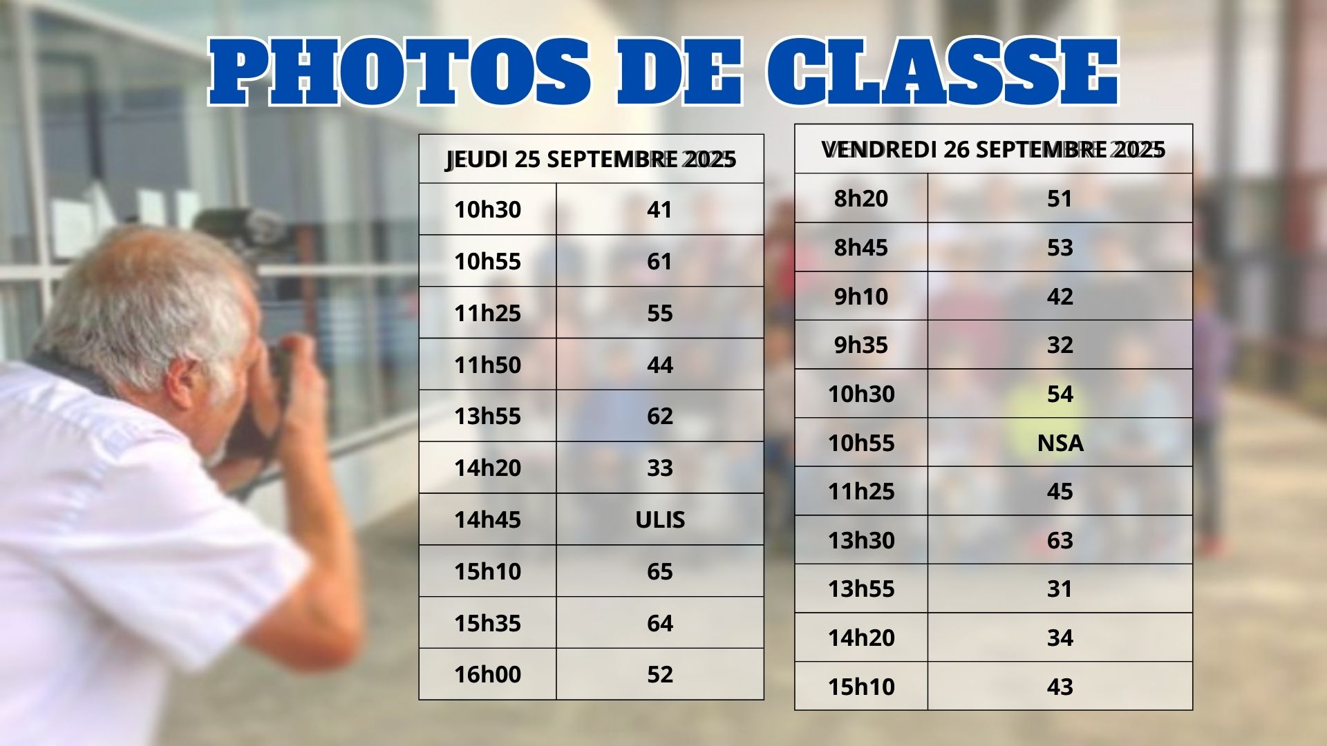 Jeudi 25 et vendredi 26 septembre, le photographe revient faire les traditionnelles photos de classe au collège avec nos élèves (ayant un droit à l'image valide) de manière individuelle et collective. Le planning dans l'article !