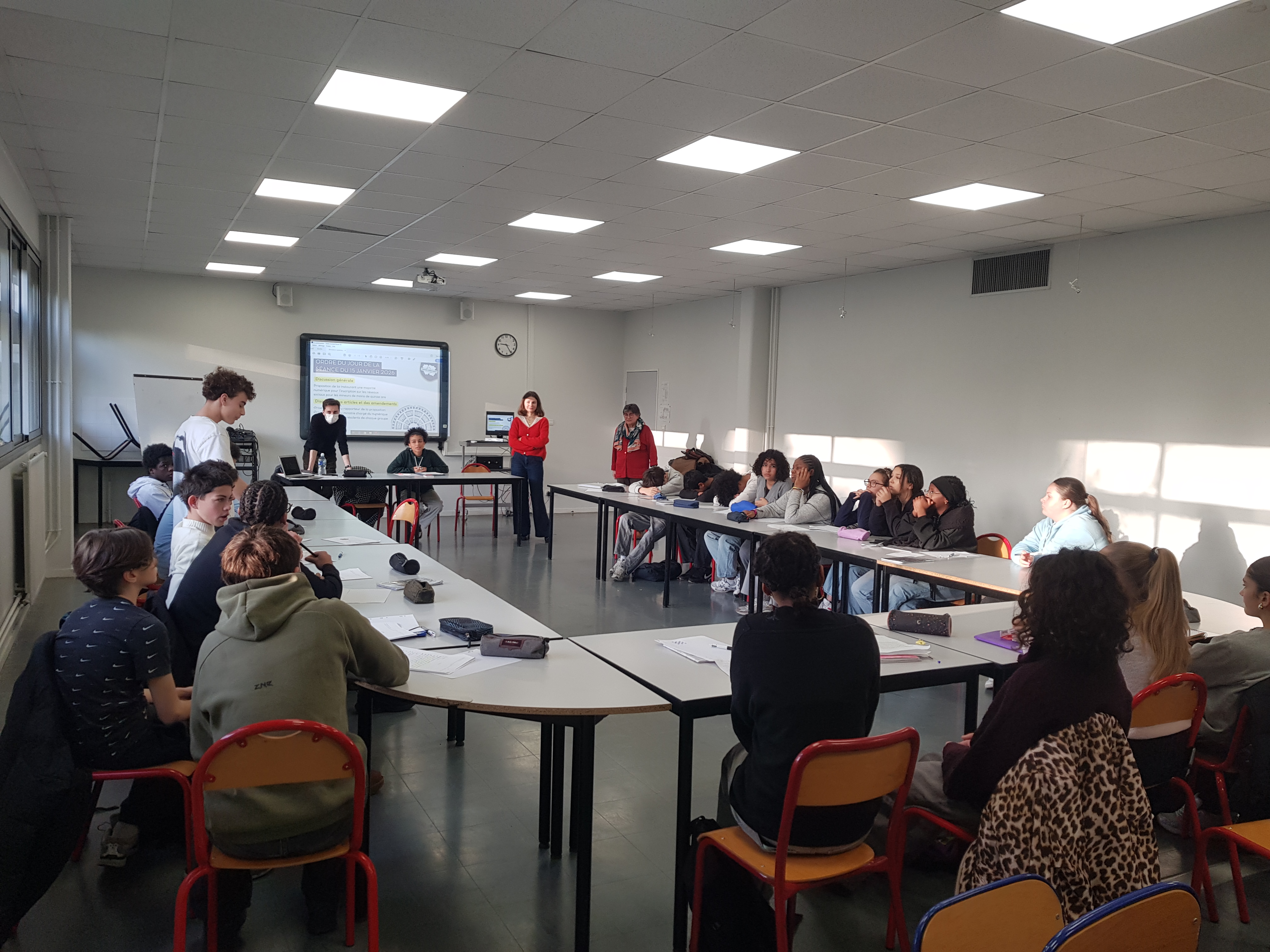 Monsieur Escudier Nino, juriste, Madame Hebert Elina, élève avocate et Madame Martine Pantz, Magistrate honoraire, tous trois membres de l'association "Parlons Démocratie" sont venus présenter aux élèves comment est produite la loi en France.